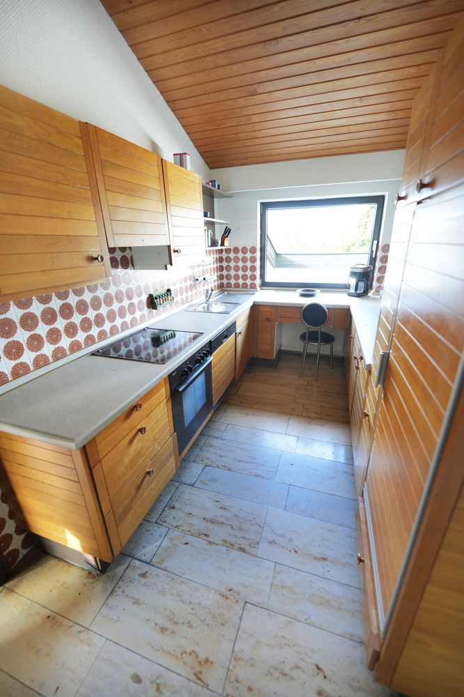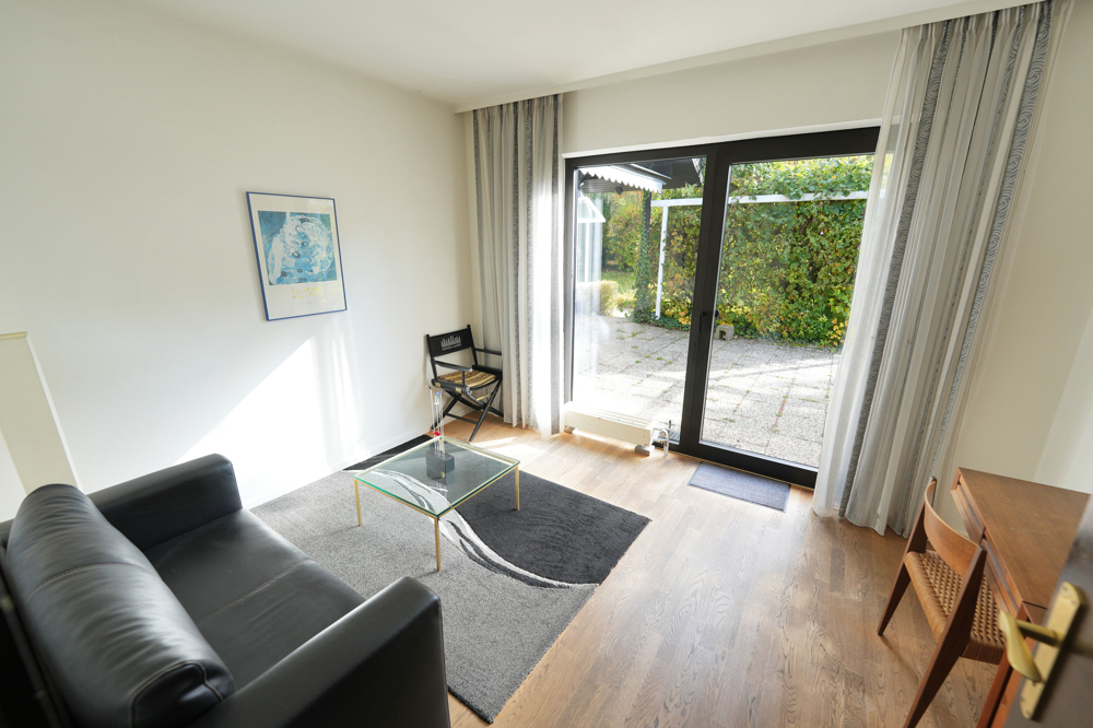 Vom Wohnbereich aus gelangt man auf die fast 60 m² große Terrasse, die in idealer Süd-West-Ausrichtung liegt und damit beste Voraussetzungen für sonnige Stunden im Freien bietet. Die großen Panoramafenster wurden bereits modernisiert und schaffen eine helle, freundliche Wohnatmosphäre.