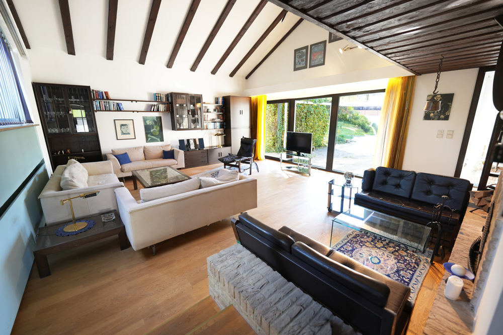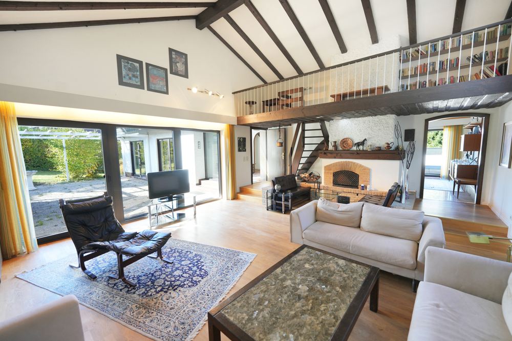 Der Wohn- und Schlafbereich befindet sich komfortabel auf einer Ebene. Im Westtrakt des Hauses befinden sich drei gut geschnittene Schlafzimmer, ein großzügiges Badezimmer mit Wanne, Dusche und Bidet sowie ein separates WC. Im Osttrakt erwartet Sie ein imposanter, rund 41 Quadratmeter großer Wohnbereich mit über fünf Metern lichter Deckenhöhe, offener Galerie und gemütlichem Kaminbereich. Große Panoramafenster lassen viel Tageslicht herein und sorgen für ein offenes, einladendes Raumgefühl. Die angrenzende Küche und das Esszimmer führen direkt auf eine etwa 20 m² große Loggia, von der sich ein fantastischer Fernblick eröffnet.