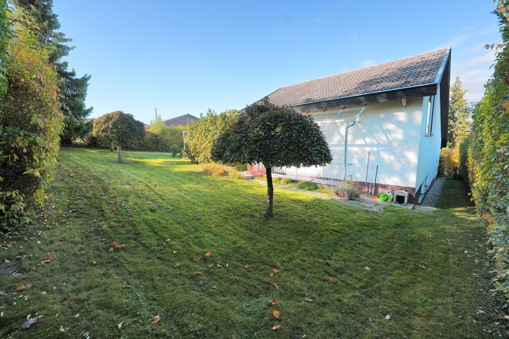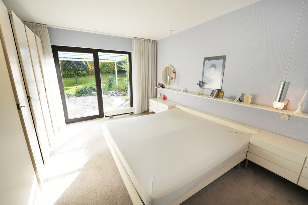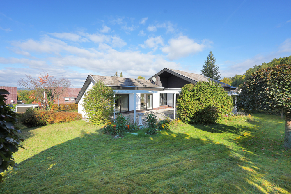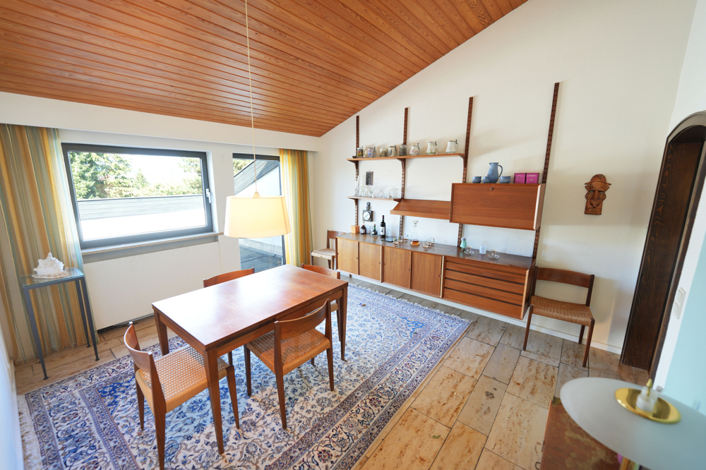 Zurück zu ÜbersichtDieses repräsentative Architektenhaus aus dem Jahr 1975 überzeugt durch seine großzügige Architektur im Winkelbungalowstil, ein weitläufiges Grundstück sowie eine idyllisch ruhige Lage inmitten der Natur. Auf über 1.000 m² Grundstück entfaltet sich eine Immobilie, die durch ihre durchdachte Raumaufteilung, lichtdurchflutete Wohnbereiche und beeindruckende Ausblicke besticht.