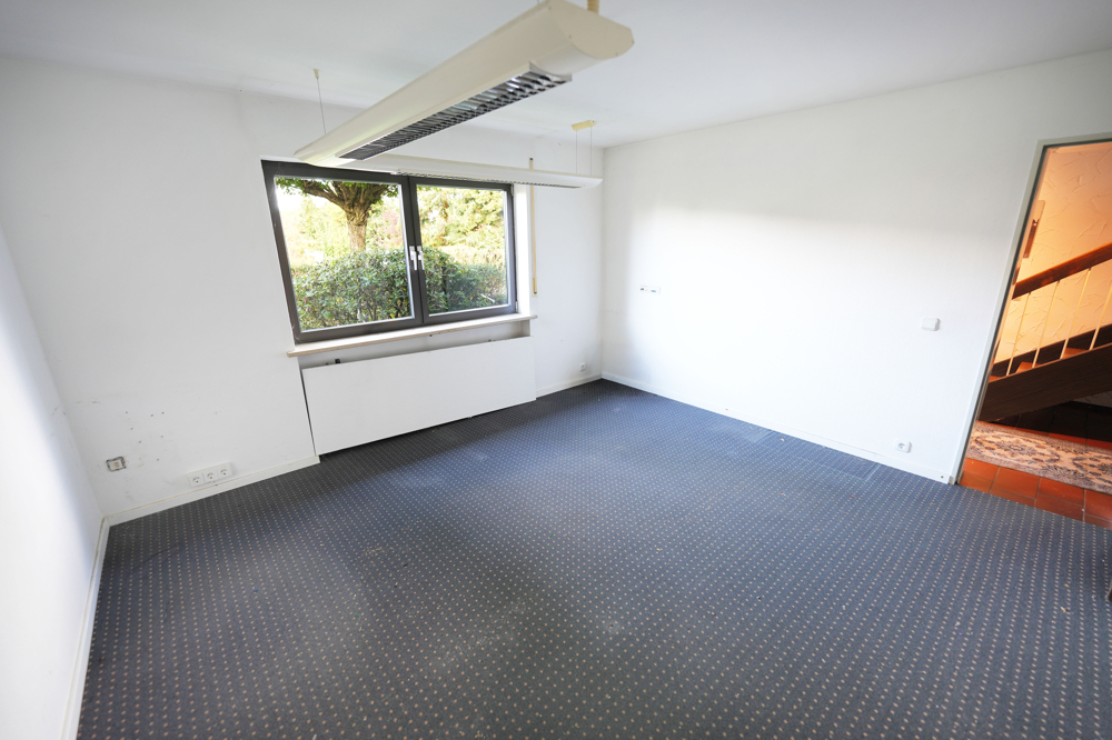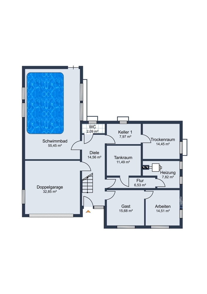 Das Eingangsgeschoss bietet eine großzügige Doppelgarage mit direktem Zugang zum Haus sowie einen separaten, etwa 30 Quadratmeter großen Büro- oder Gästebereich mit eigenem Gäste-WC. Ebenso befindet sich auf dieser Ebene ein ca. 60qm großer Bereich, der ursprünglich für den Einbau eines Innenschwimmbades mit Sauna vorgesehen/vorbereitet war. Hier bieten sich vielfältige Möglichkeiten von der Realisierung eines eigenen Innenschwimmbades bis hin zu alternativen Nutzungen wie z.B. Fitnessraum, Heimkino, Atelier, Abstellfläche o.ä.. Ergänzt wird das Raumangebot durch weitere praktische Keller- und Nutzräume.