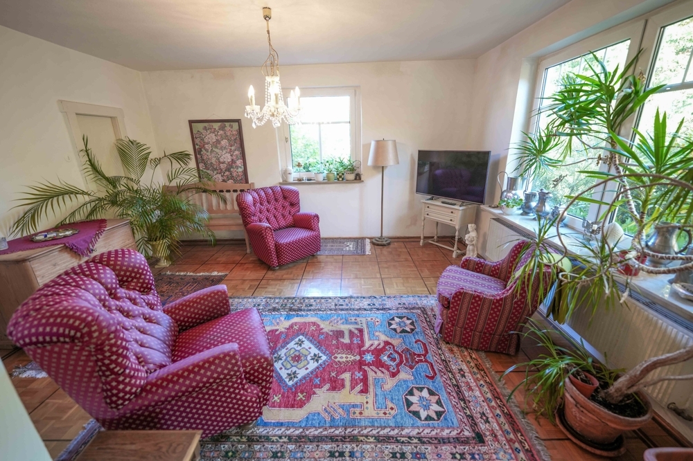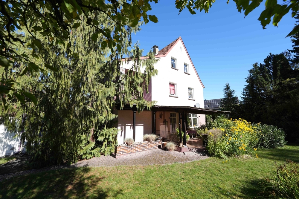 Zurück zu ÜbersichtDieses charmante Einfamilienhaus wurde im Jahr 1940 erbaut und später durch einen Anbau und ein Nebengebäude erweitert. Highlight des Hauses ist das traumhafte 1.500 m² große Grundstück mit altem Baumbestand, dass an eine landwirtschaftliche Fläche mit dahinter liegendem Waldgebiet angrenzt. Das Haus selbst besticht durch seinen ursprünglichen Charme und bietet eine solide Basis für die Umsetzung eigener Gestaltungsideen. Es verfügt über eine Wohnfläche von ca. 150 m² auf zwei Wohnetagen, die individuell gestaltet und renoviert werden können. Im Dachgeschoss befinden sich zusätzlich noch weitere Räume, die bisher ebenfalls als Wohnräume genutzt wurden (Nicht in der Wohnfläche enthalten). Das Haus ist voll unterkellert.