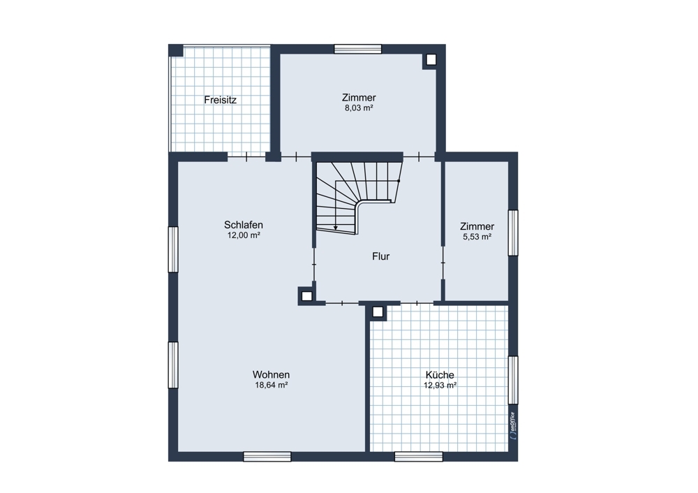 - Erdgeschoss: offenes Wohn-/Esszimmer, separate Küche mit kleiner Speisekammer, kleines Duschbad, separates Gäste-WC, Abstellraum, großzügiger überdachter Freisitz mit Zugang in den Garten