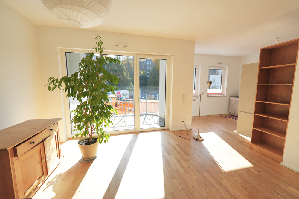 Der großzügige Wohn- und Essbereich ist mit edlem Parkettboden versehen und wird durch eine komfortable Fußbodenheizung angenehm temperiert. Große Fensterfronten sorgen für viel Tageslicht und führen auf den sonnigen Balkon.